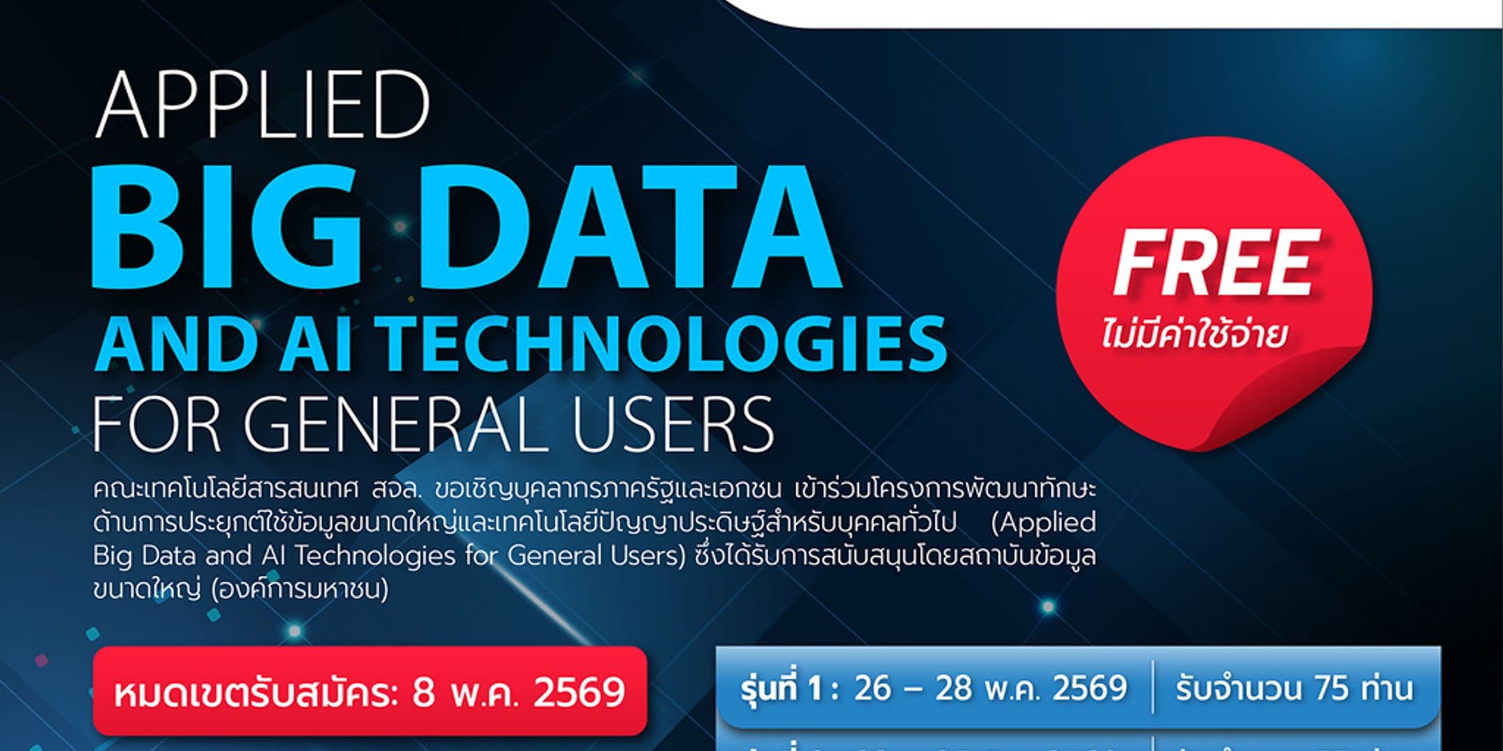 คณะเทคโนโลยีสารสนเทศ สจล. ขอเชิญบุคลากรภาครัฐและเอกชน เข้าร่วมโครงการพัฒนาทักษะด้านการประยุกต์ใช้ข้อมูลขนาดใหญ่และเทคโนโลยีปัญญาประดิษฐ์สำหรับบุคคลทั่วไป (Applied Big Data and AI Technologies for General Users) ซึ่งได้รับการสนับสนุนโดยสถาบันข้อมูลขนาดใหญ่ (องค์การมหาชน)
